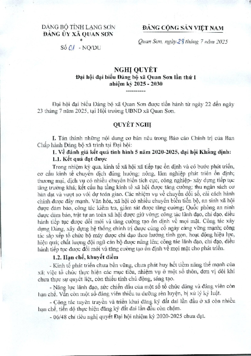 | Tiêu đề văn bản | Nghị quyết đại hội Đảng bộ xã Quan Sơn lần thứ I, nhiệm kỳ 2025-2030./. | ||