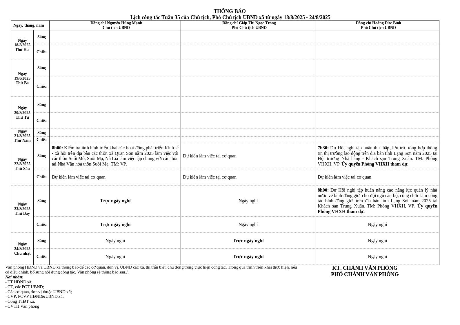 | Tiêu đề văn bản | Lịch công tác Tuần 35 của Chủ tịch, Phó Chủ tịch UBND xã từ ngày 18/8/2025 - 24/8/2025 | ||