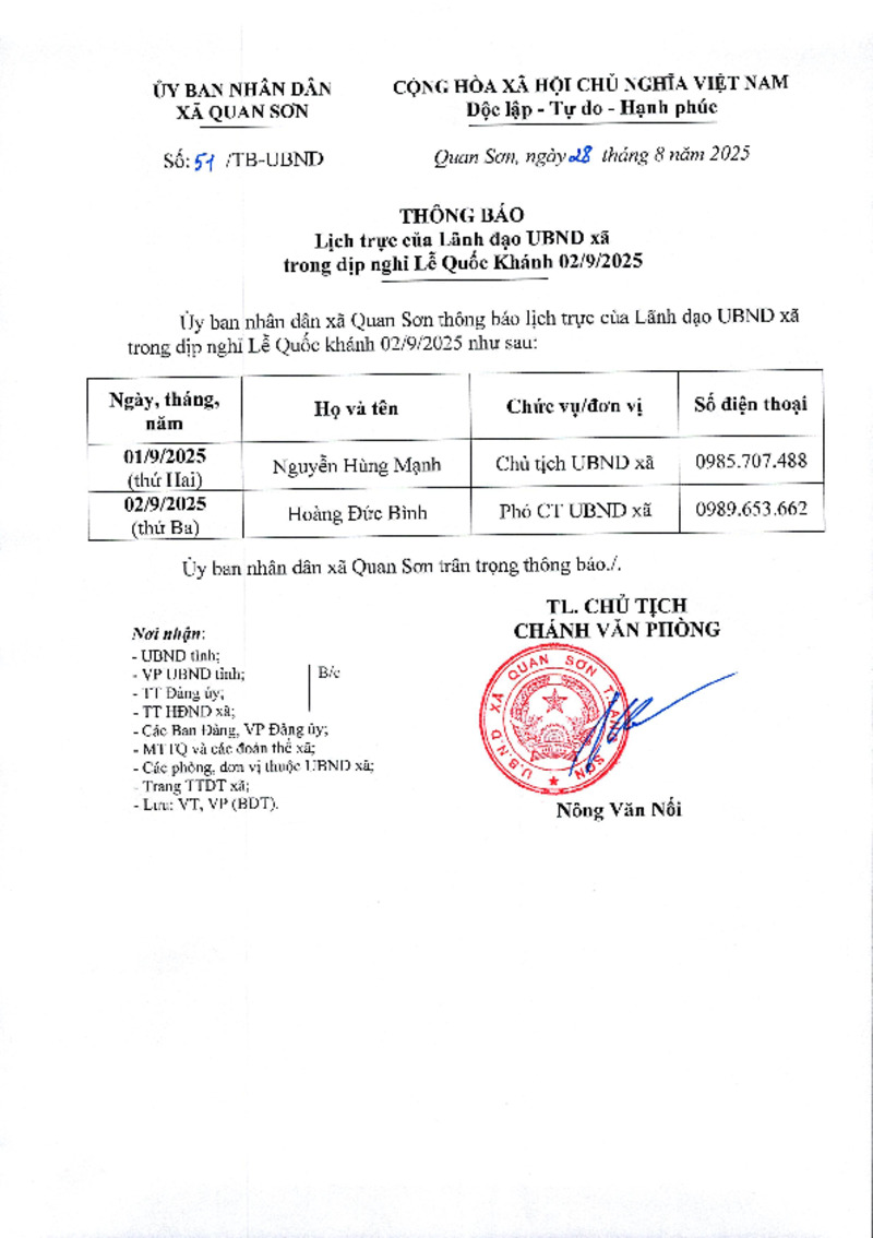 | Tiêu đề văn bản | Lịch trực của Lãnh đạo UBND xã Quan Sơn trong dịp nghỉ Lễ Quốc Khánh 02/9/2025 | ||