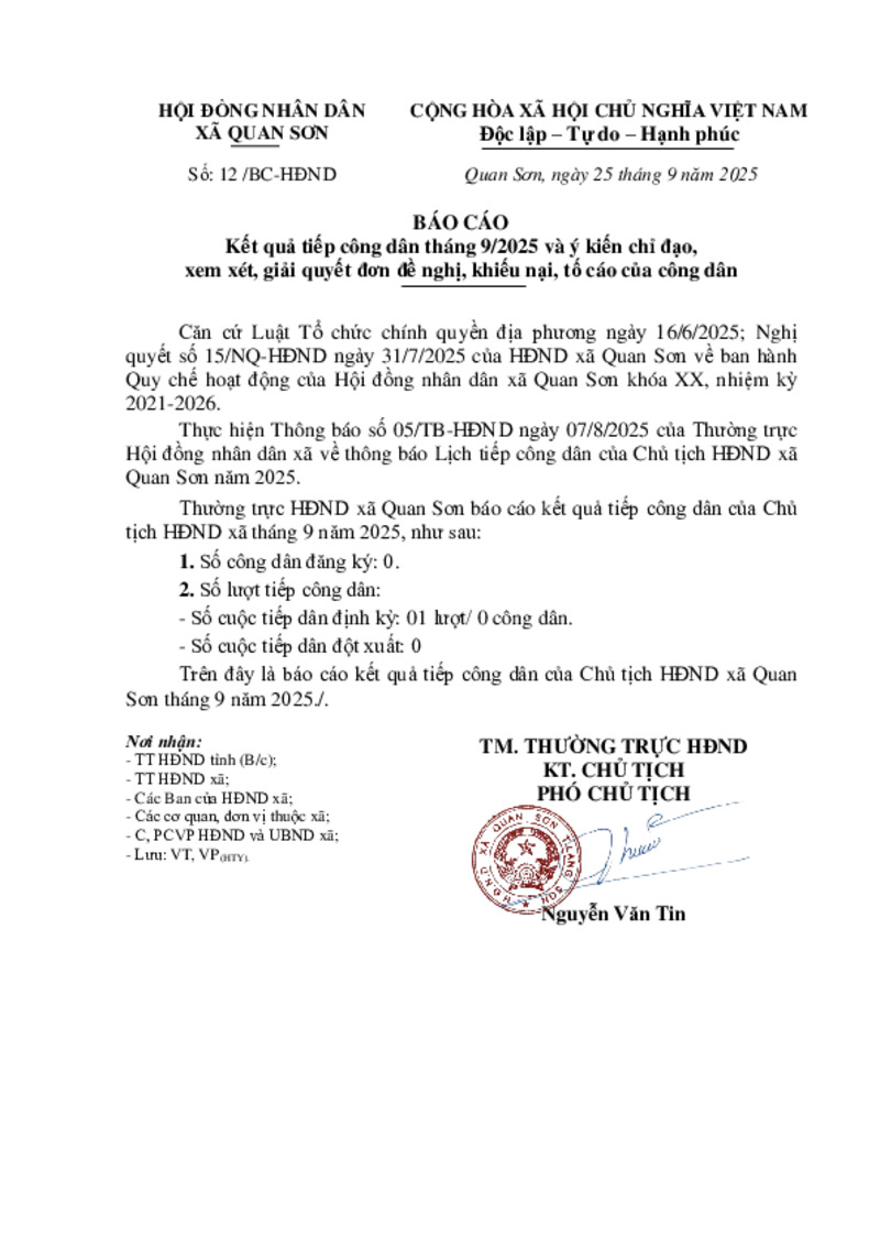 | Tiêu đề văn bản | Báo cáo kết quả tiếp công dân tháng 9/2025 Chủ tịch HĐND xã Quan Sơn | ||