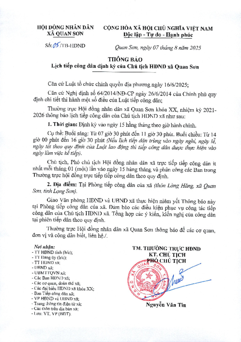 | Tiêu đề văn bản | Lịch tiếp công dân định kỳ của Chủ tịch HĐND xã Quan Sơn | ||