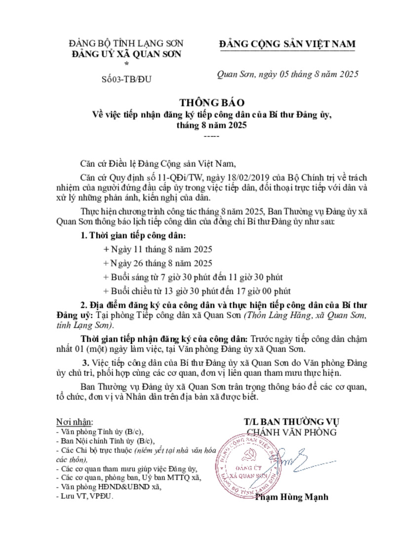 | Tiêu đề văn bản | Về việc tiếp nhận đăng ký tiếp công dân của Bí thư Đảng ủy, tháng 8 năm 2025 | ||