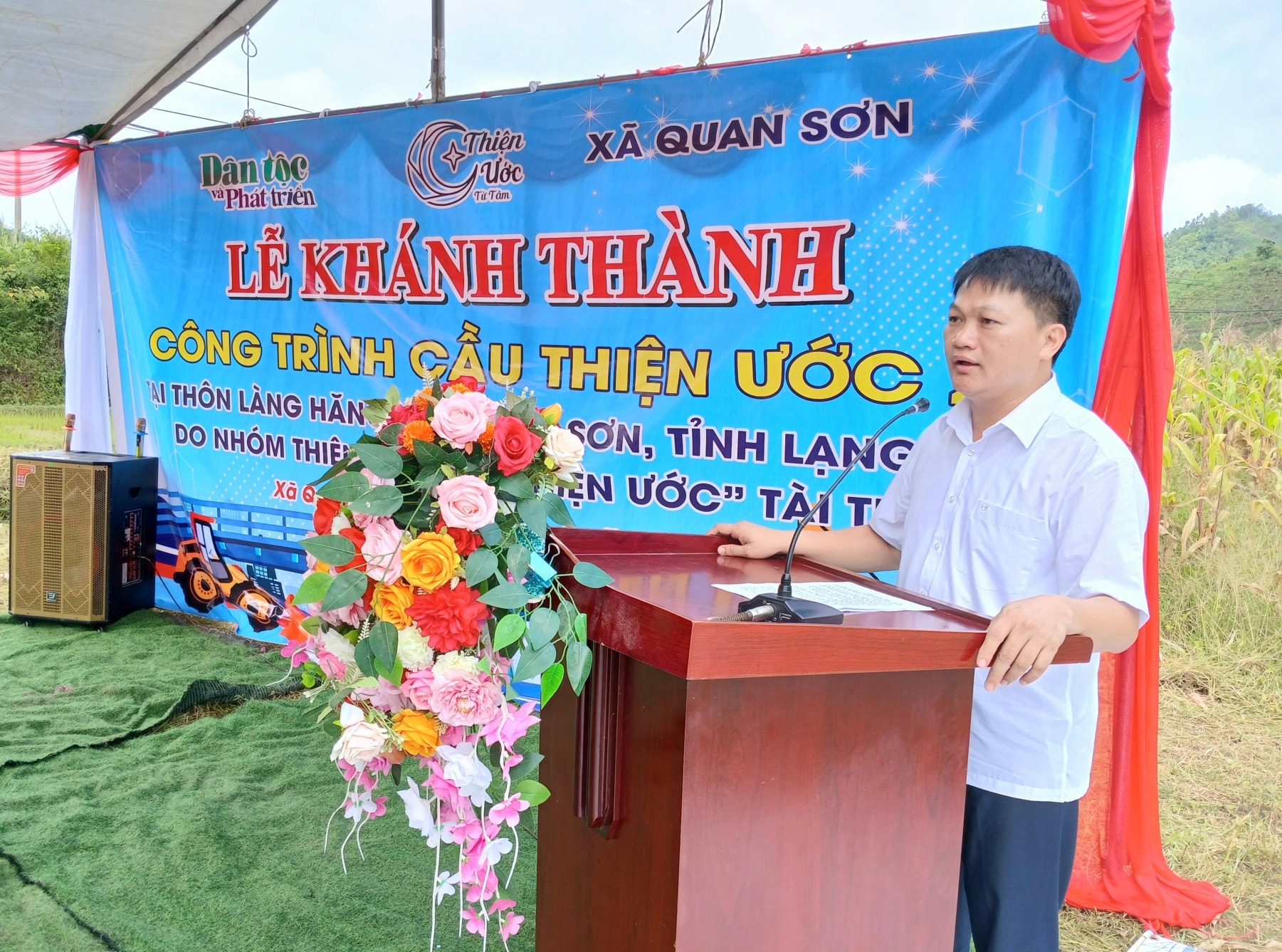Ngày 01/8/2025, tại xóm Đồng Xoong, thôn Làng Hăng, xã Quan Sơn. Đảng ủy, UBND, UB MTTQ VN xã Quan Sơn phối hợp với Báo Dân tộc và Phát triển, Nhóm Thiện nguyện Thiện ước tổ chức Lễ khánh thành Cầu dân sinh Thiện ước 2.