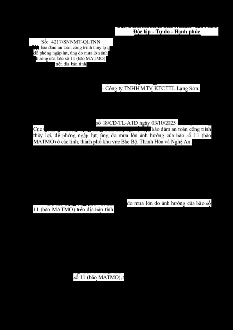 | Tiêu đề văn bản | Bảo đảm an toàn công trình thuỷ lợi, đề phòng ngập lụt, úng do mưa lớn ảnh hưởng cơn bão số 11 (bão MATMO) trên địa bàn tỉnh | ||
