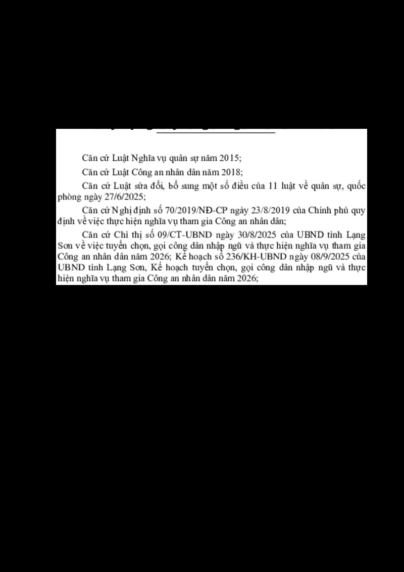 | Tiêu đề văn bản | KẾ HOẠCH Tuyển chọn, gọi công dân nhập ngũ và thực hiện nghĩa vụ tham gia Công an nhân dân năm 2026 | ||
