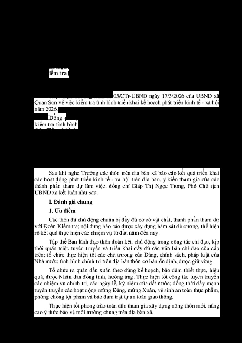 | Tiêu đề văn bản | Kết luận của đồng chí Giáp Thị Ngọc Trong, Phó Chủ tịch UBND xã về kiểm tra tình hình triển khai các hoạt động phát triển kinh tế - xã hội trên địa bàn các thôn xã Quan Sơn năm 2026 | ||