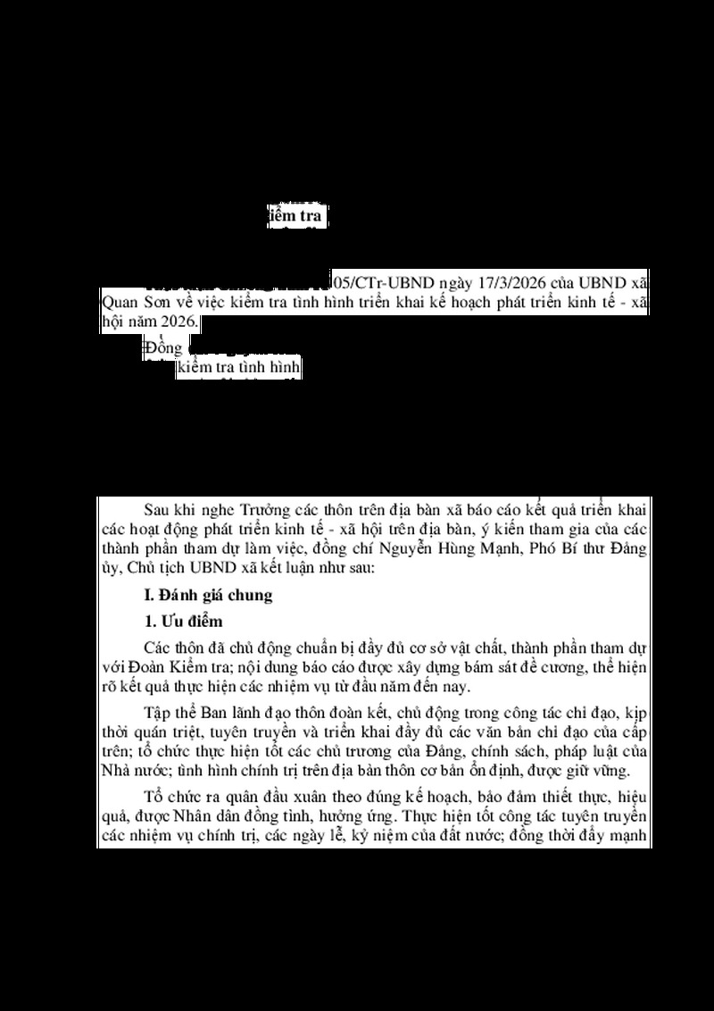 | Tiêu đề văn bản | THÔNG BÁO Kết luận của đồng chí Nguyễn Hùng Mạnh, Phó Bí thư Đảng ủy, Chủ tịch UBND xã về kiểm tra tình hình triển khai các hoạt động phát triển kinh tế - xã hội trên địa bàn các thôn xã Quan Sơn năm 2026 | ||